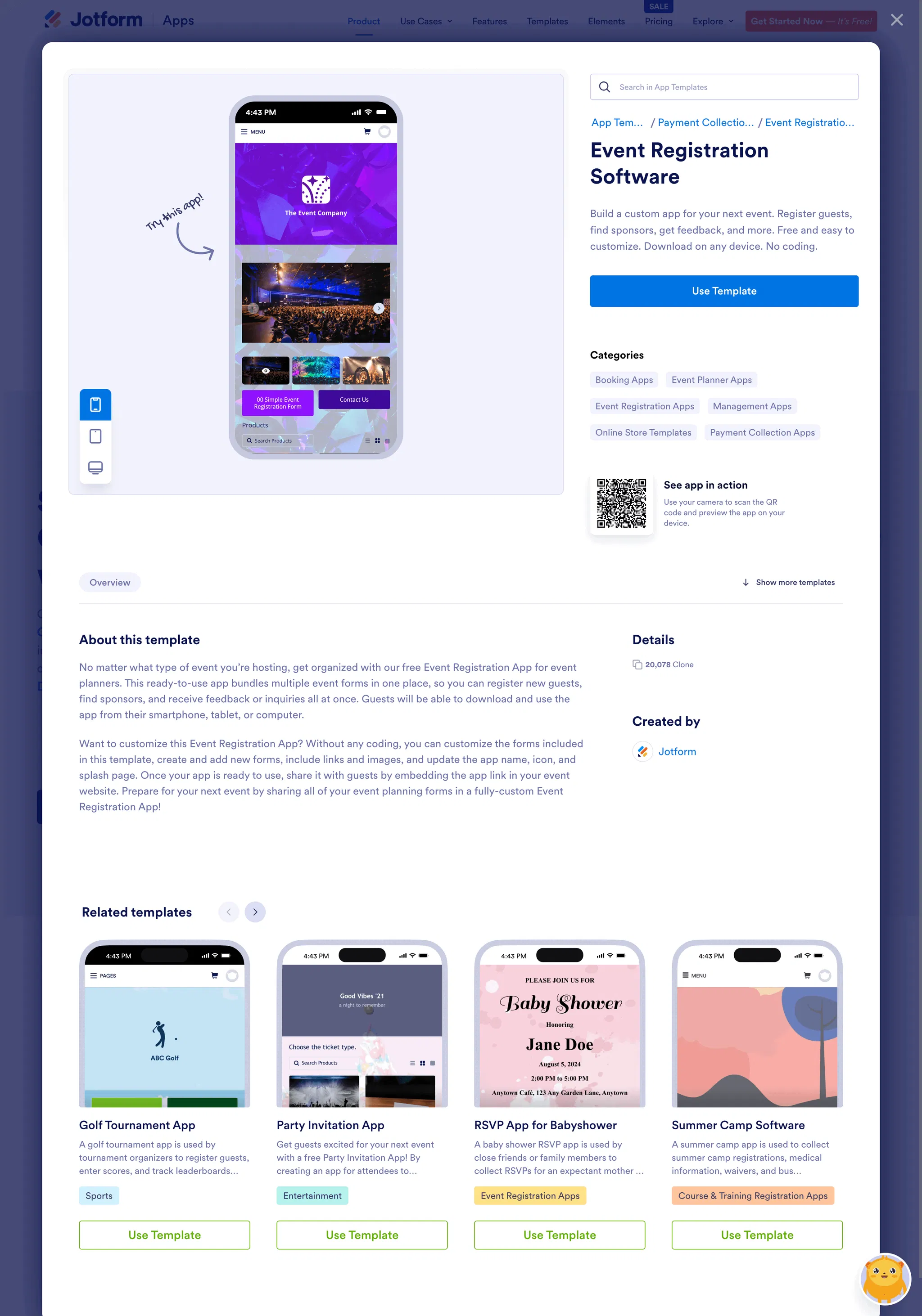 - Search for the Template: Search for the Event Registration App template from Jotform’s extensive library of 700+ app templates. Click Use Template.